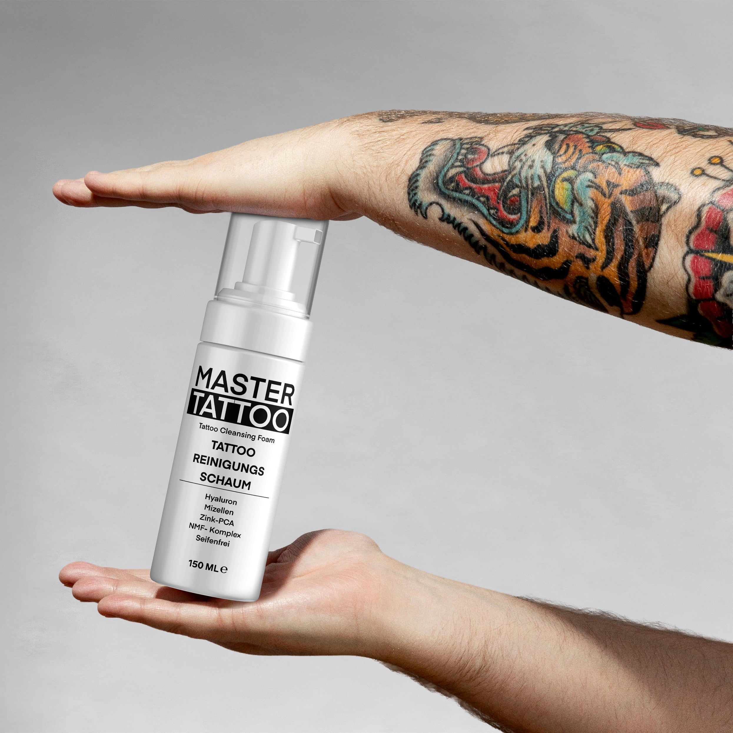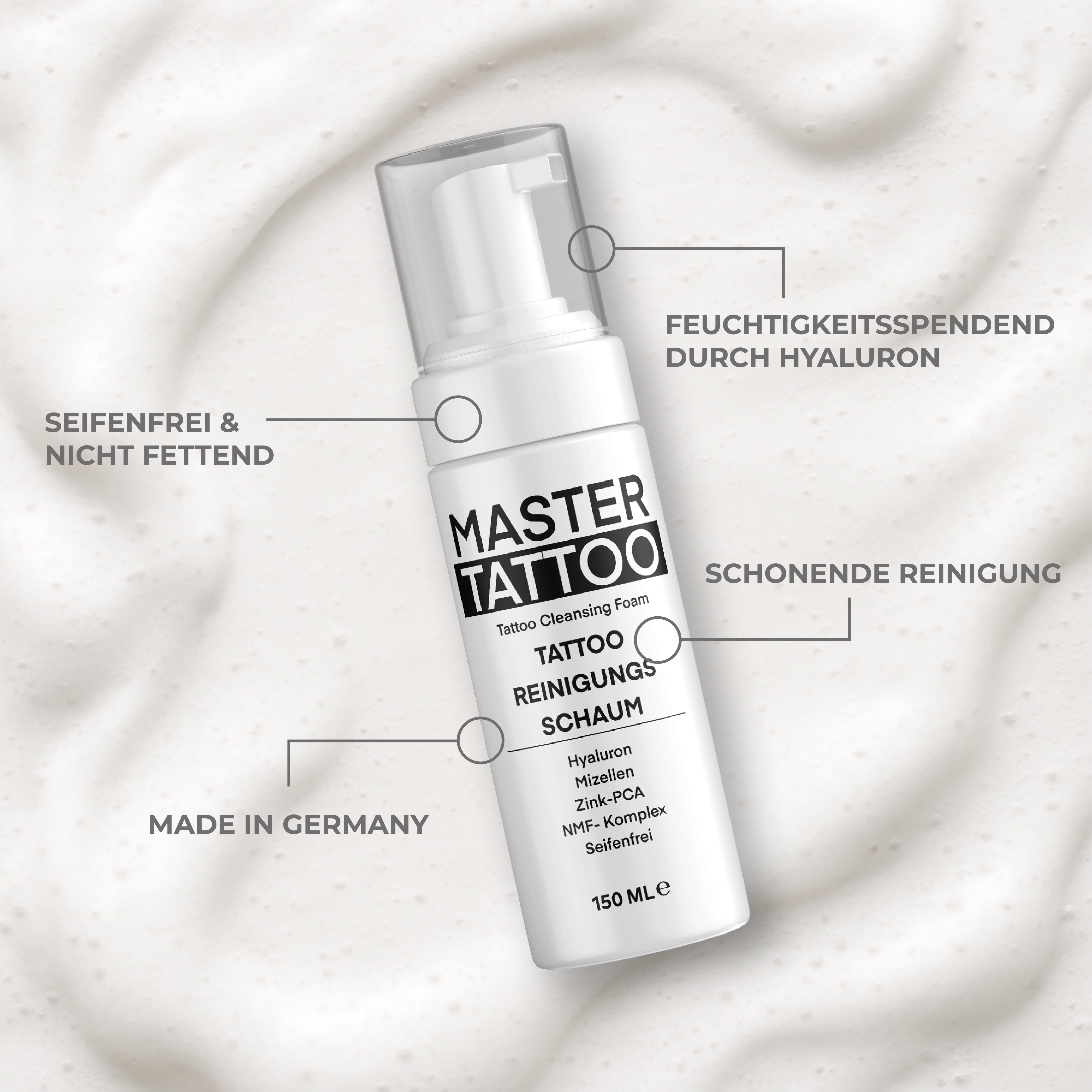 Der Master Tattoo Reinigungsschaum wurde speziell entwickelt, um tätowierte Haut besonders sanft und gründlich zu reinigen – ganz ohne Seife. Die innovative Formel mit Hyaluron, Micellen, Zink PCA und dem NMF-Komplex spendet Feuchtigkeit, unterstützt die natürliche Hautbalance und sorgt für ein angenehm gepflegtes Hautgefühl.